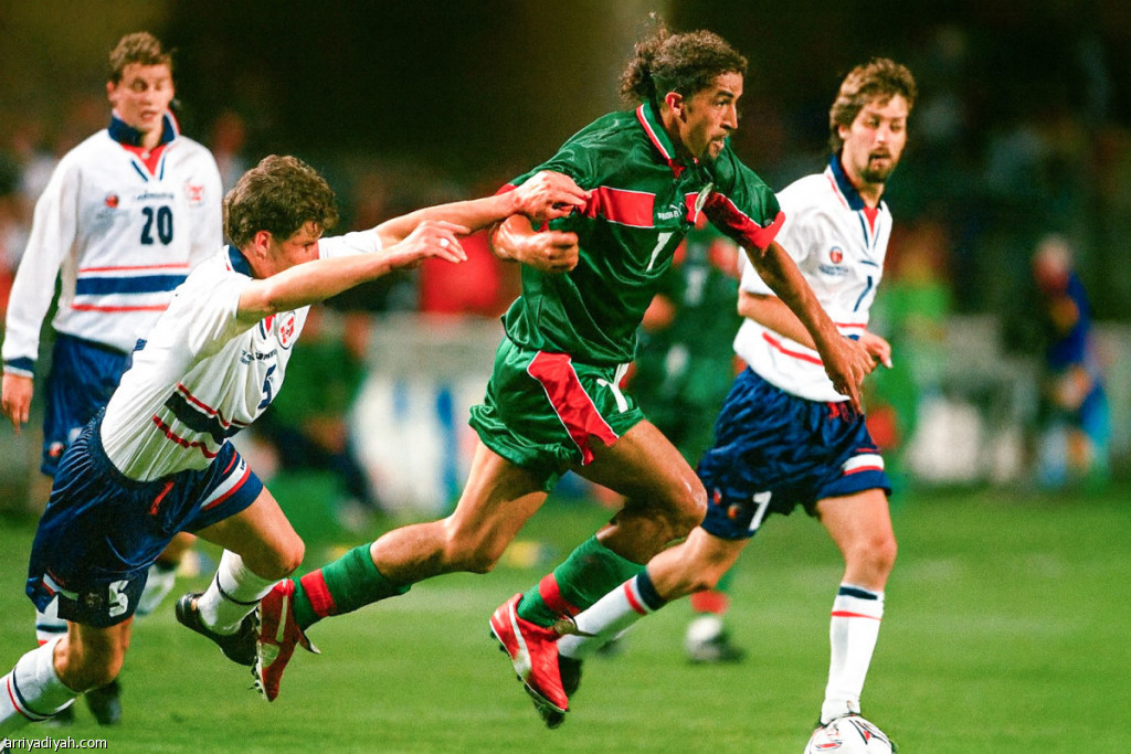 المهاجم المغربي مصطفي حاجي، ينطلق بالكرة خلال مباراة منتخب بلاده ونظيره النرويجي في كأس العالم 1998 (أرشيفية)